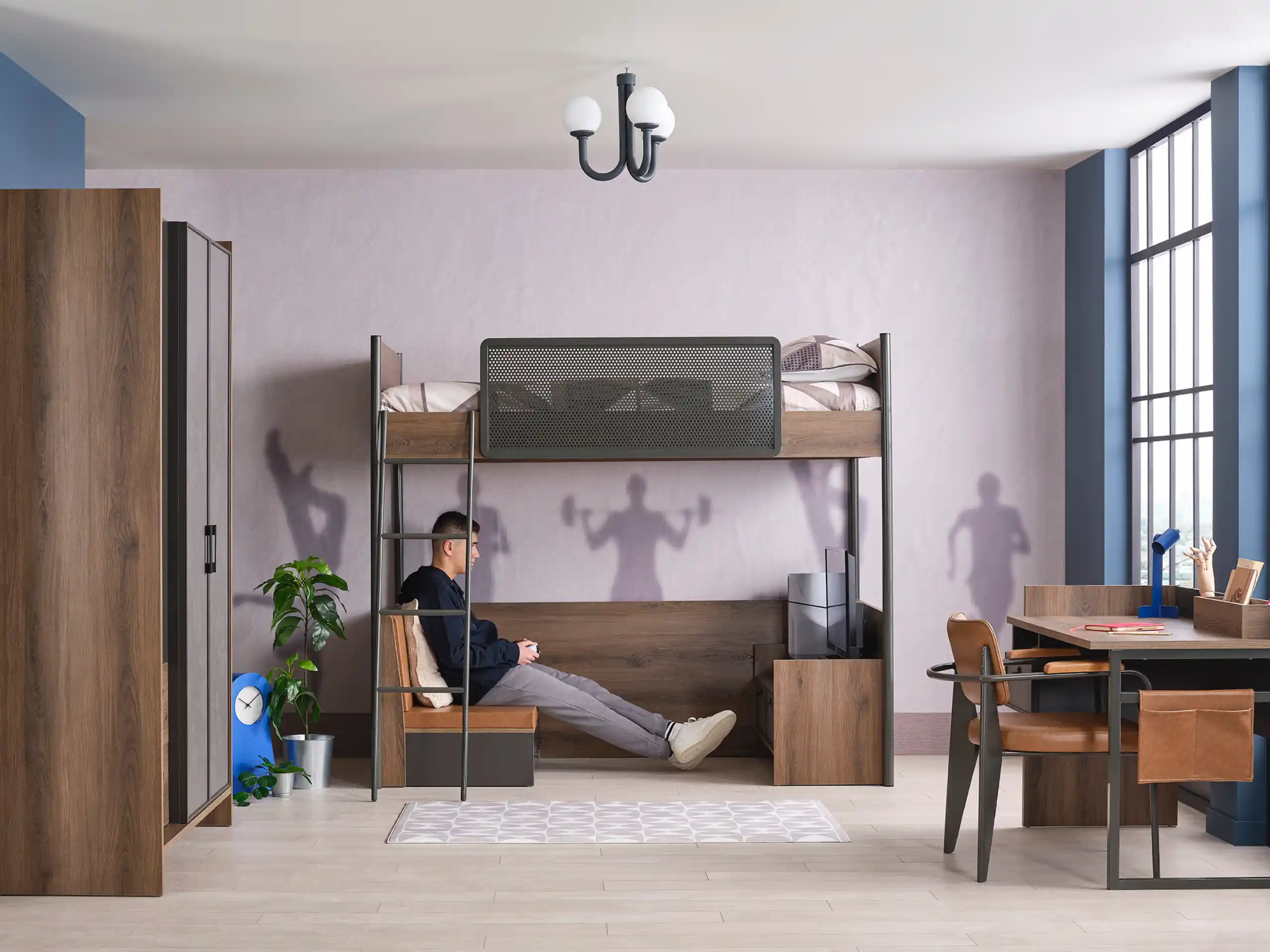 The Action Bunk Bed is a smart, space-saving choice for busy families and apartment living, featuring a sturdy metal frame, cozy wood-look panels, and a modern perforated guardrail for safety and style.