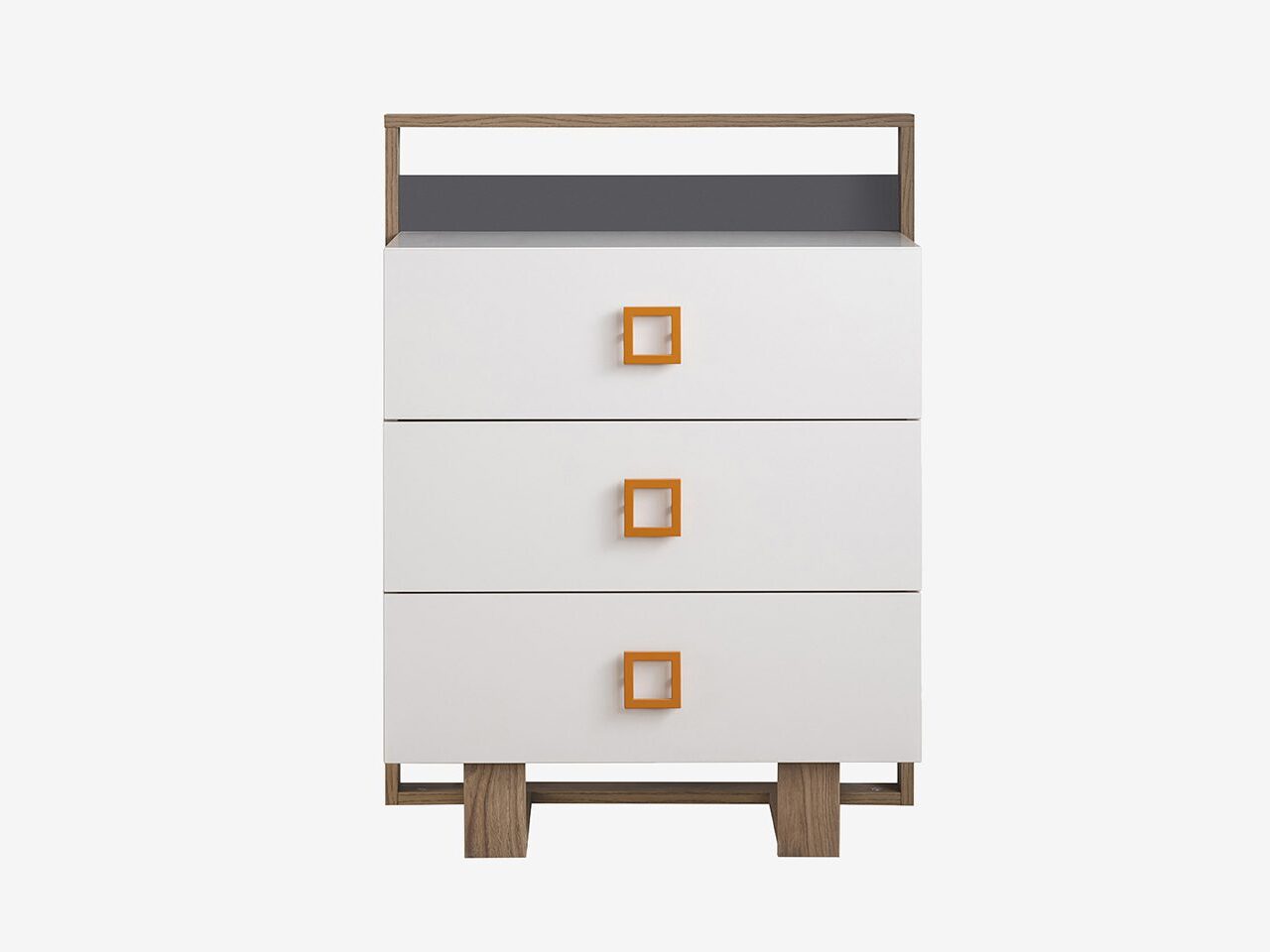 Keep your space tidy and stylish with the Comfort Chest of Drawers—featuring a crisp white finish, warm wood accents, and playful square handles, plus three roomy drawers for easy storage of clothes, toys, or essentials.