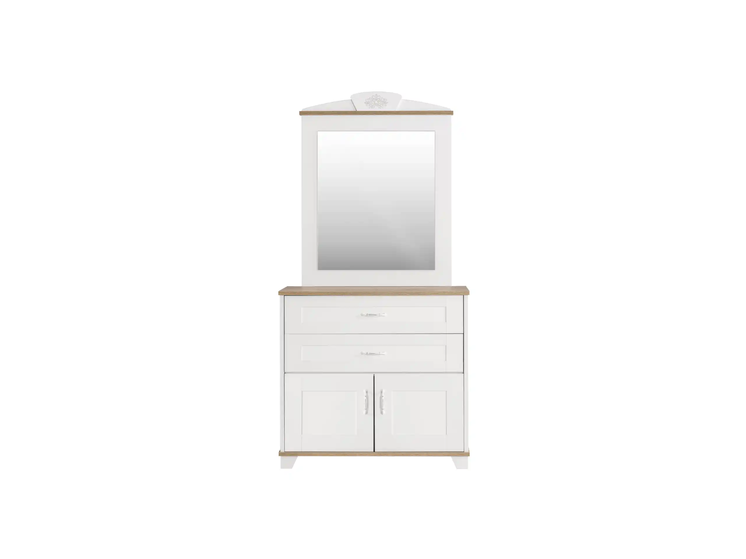 Sturdy white frame with natural wood accent and floral detail